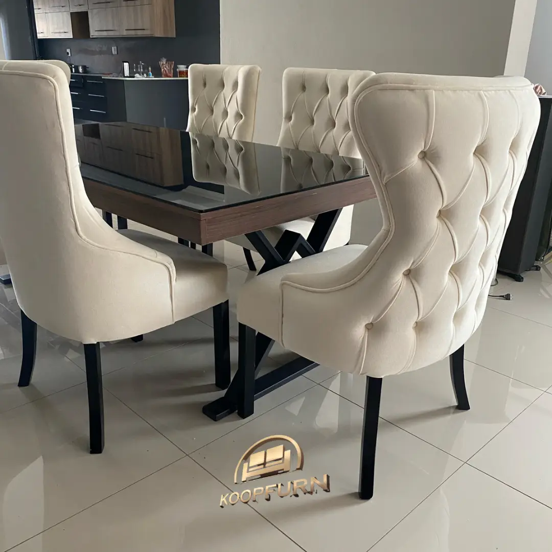 Elevate your dining space with our sophisticated wooden table featuring a stunning glass top, paired with luxurious high-back buttoned dining chairs. This stylish set combines modern elegance with timeless charm.