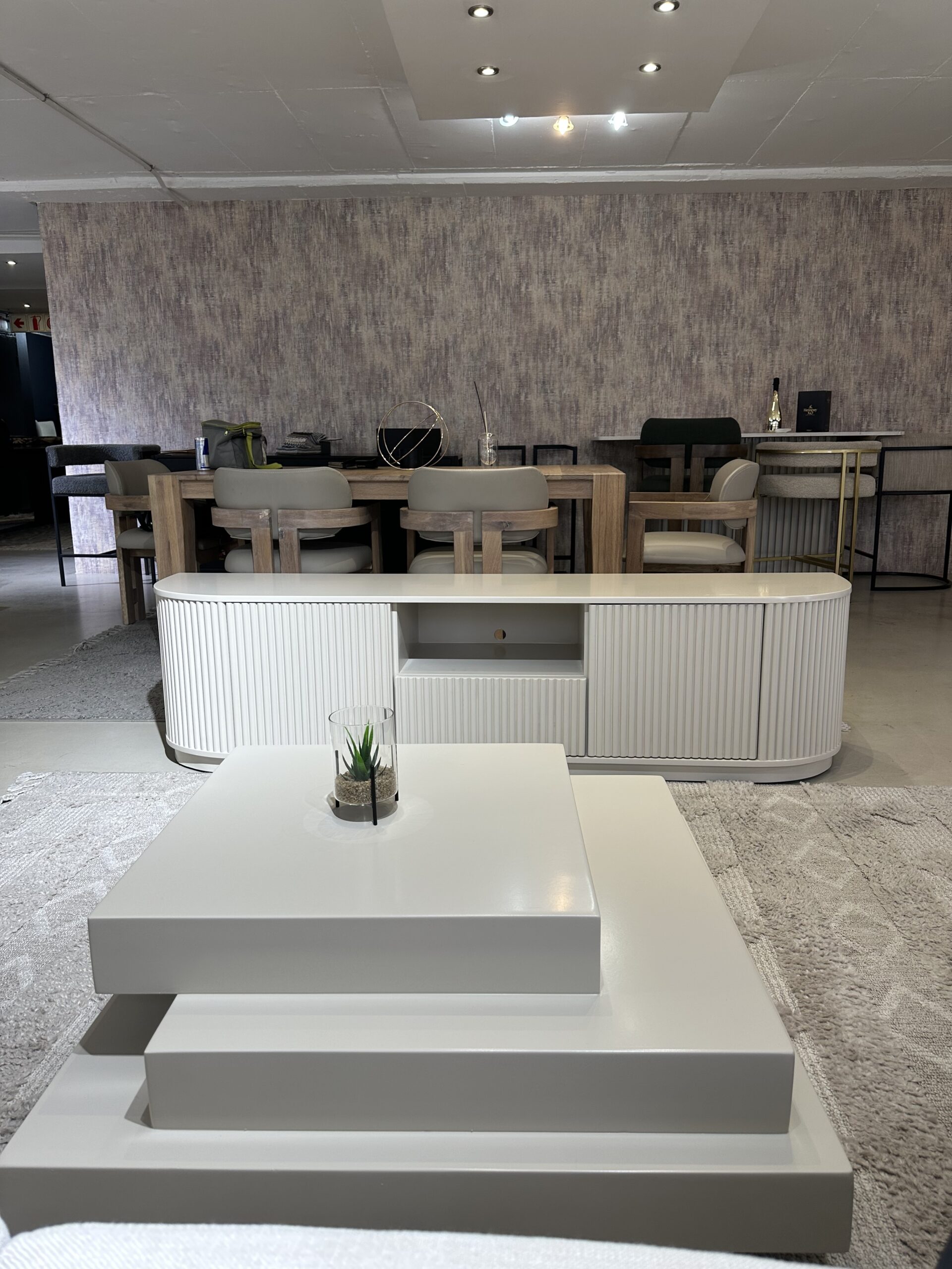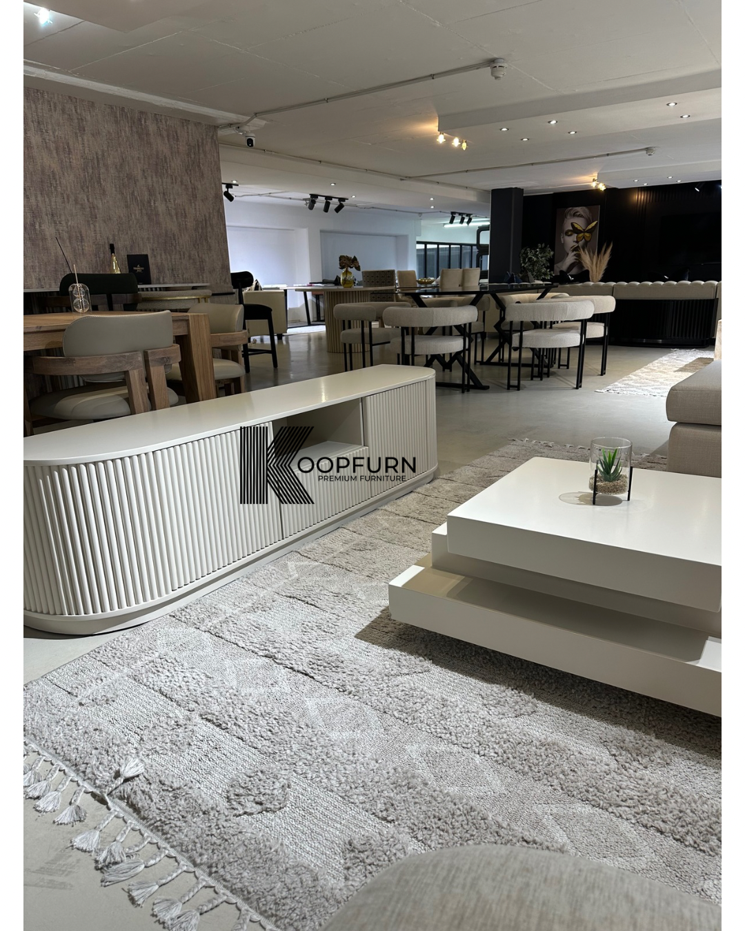 The low-profile TV stand offers generous storage with concealed compartments, keeping your entertainment area neat and clutter-free while maintaining a clean, minimalist aesthetic. Its curved edges and textured fronts add visual interest, making it a statement piece in any modern lounge or open-plan living area.