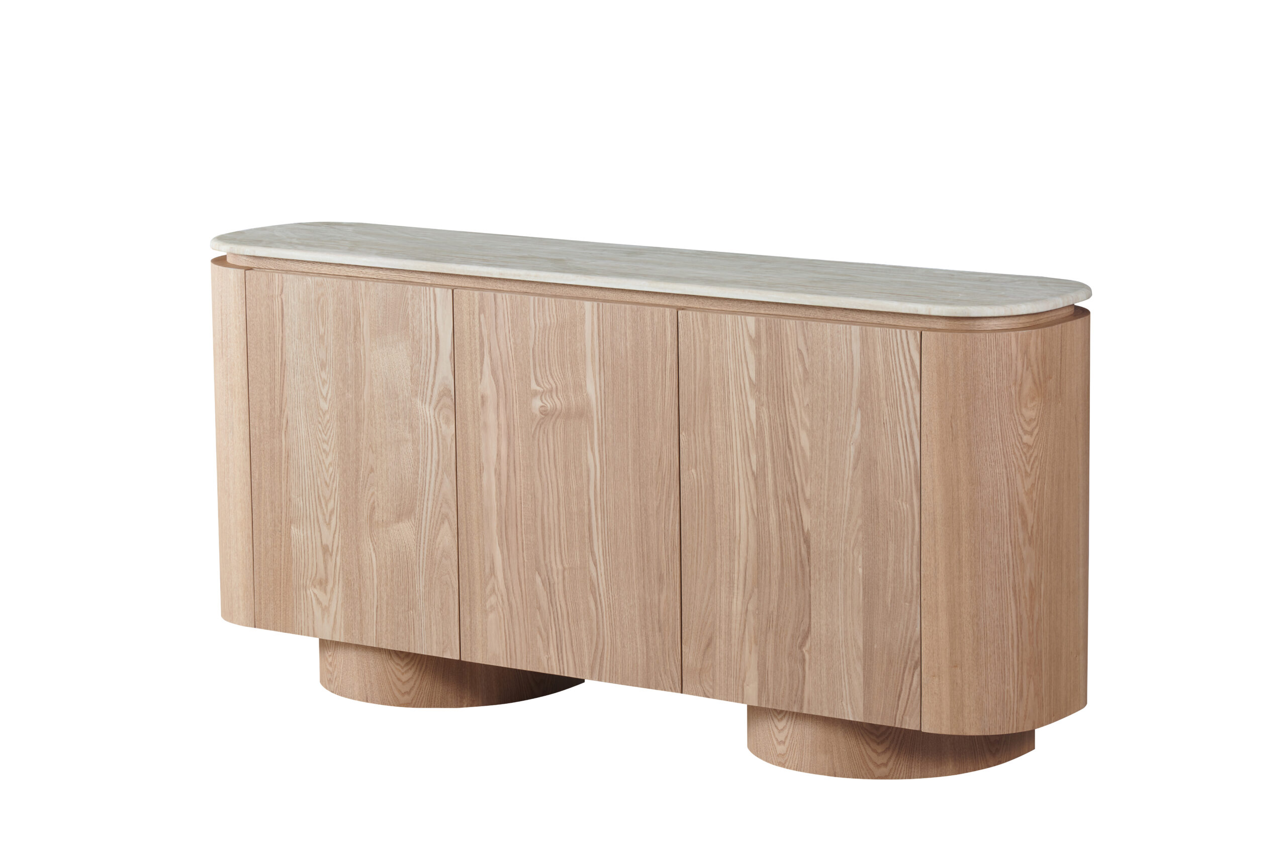 The curved edges and solid cylindrical base add a soft architectural presence, transforming this sideboard from simple storage into a statement furniture piece.