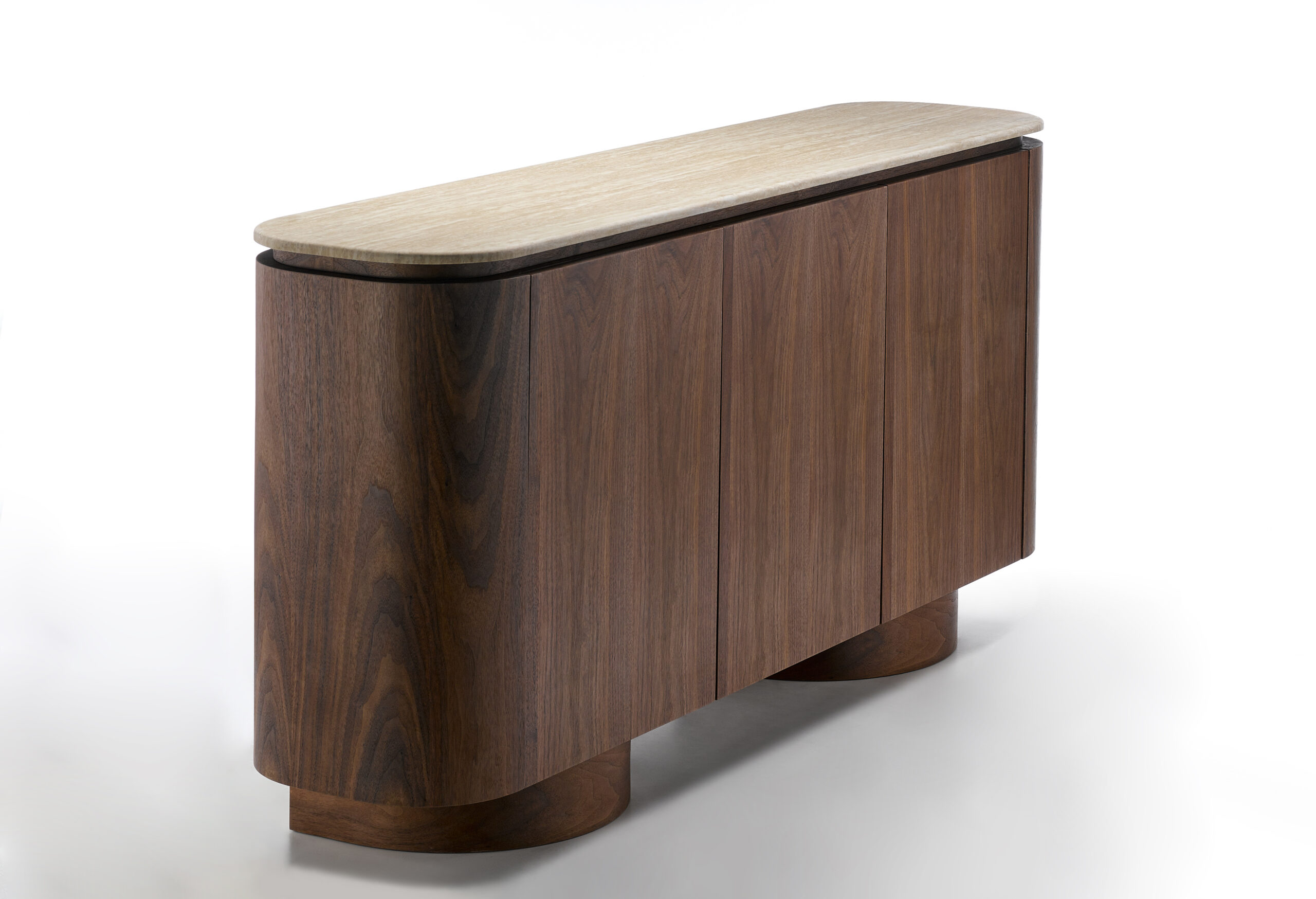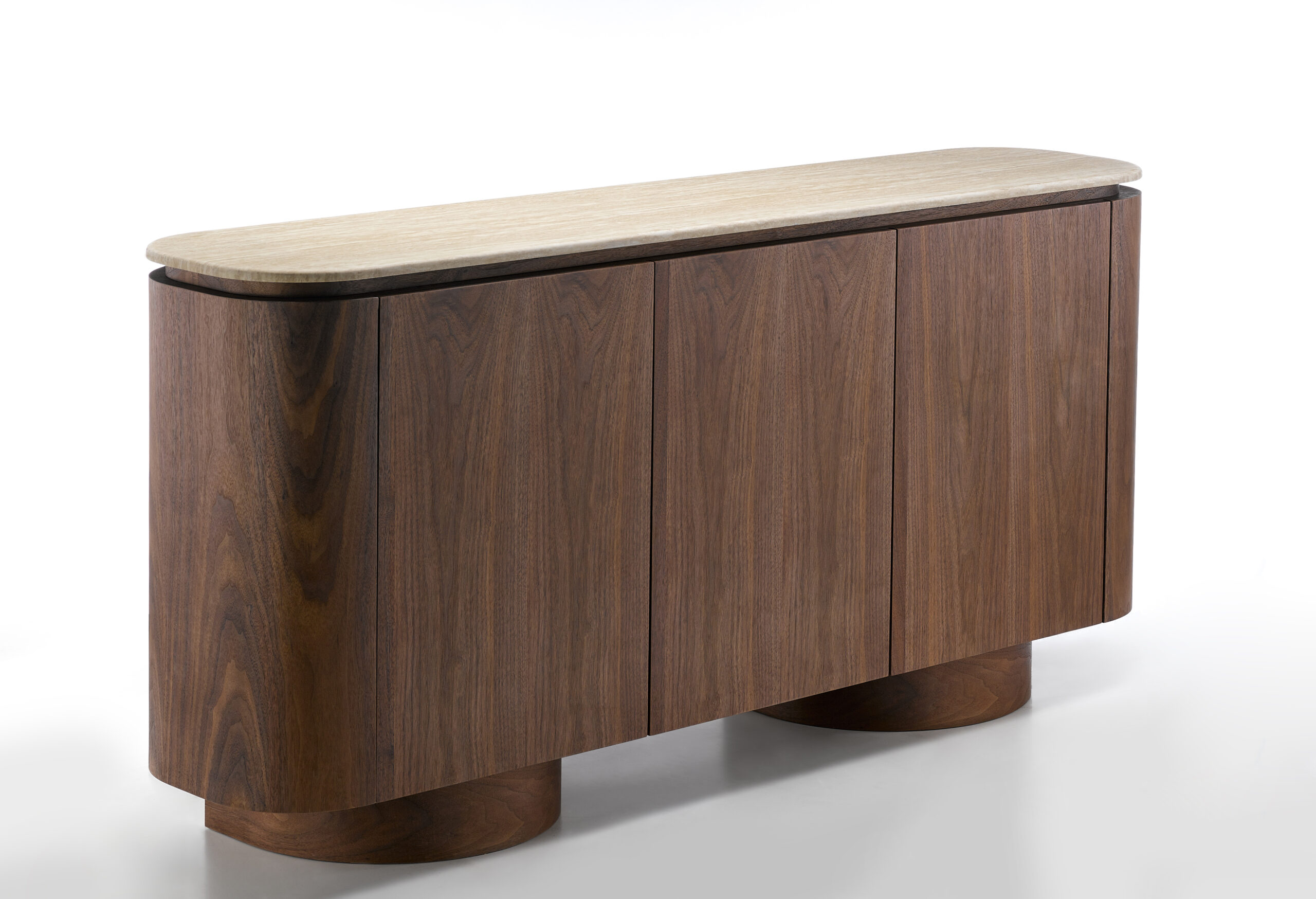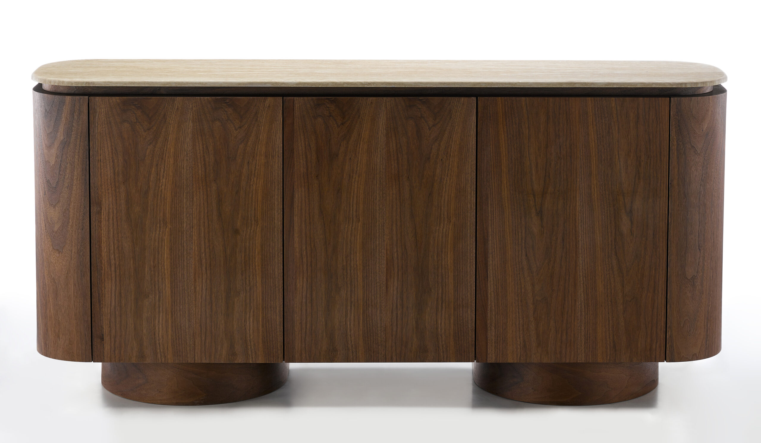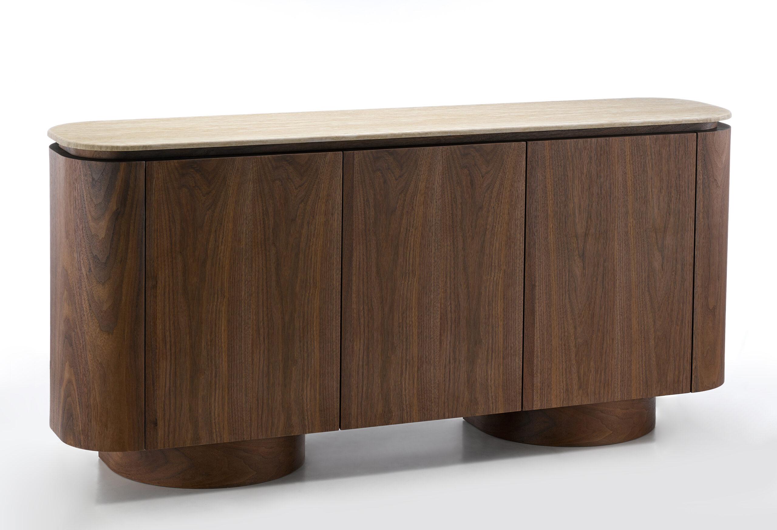 The rounded corners and solid cylindrical base give this sideboard a soft yet bold character, transforming functional storage into a refined design feature.