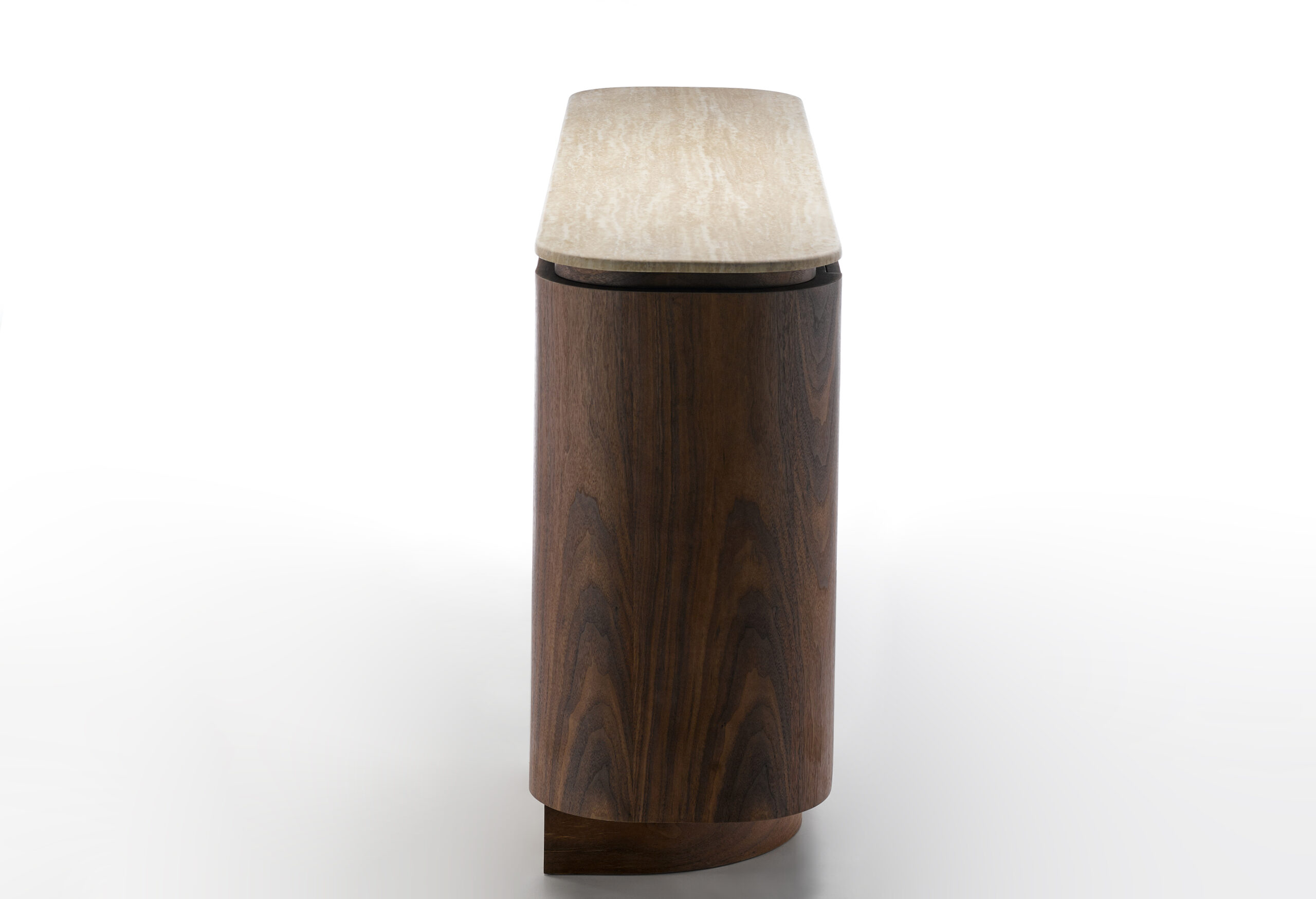 Introduce depth and warmth into your interior with this beautifully crafted walnut buffet cabinet. Designed with curved edges and a distinctive cylindrical base, this piece balances architectural presence with everyday practicality.